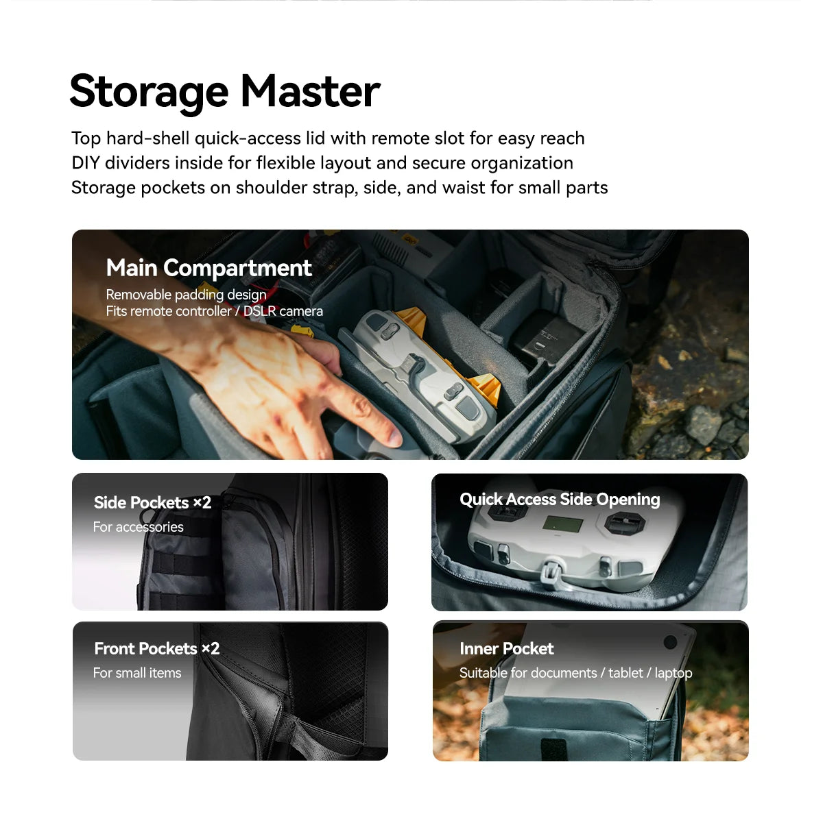 A top hard-shell quick-access lid with a remote slot offers easy retrieval. Inside, DIY dividers create a flexible layout, while shoulder, side, and waist pockets store small items.