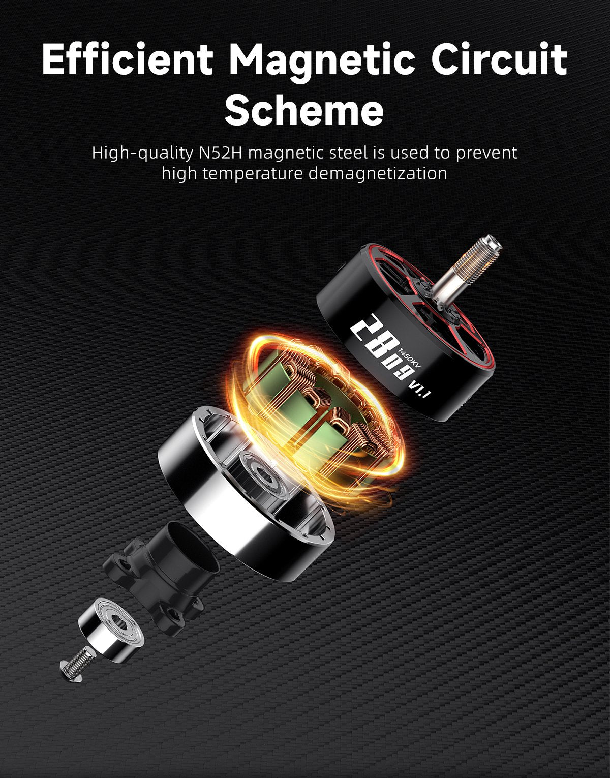 The GEPRC SPEEDX2 2809 V1.1 is built for 7–8 inch long-range FPV drones. The stator uses 0.2mm Kawasaki silicon steel for efficient magnetic flow, paired with high-temp N52H magnets that offer 30% better heat resistance. Finished in matte black with red accents, it looks as sharp as it performs. The motor mounting pattern is 19×19mm.