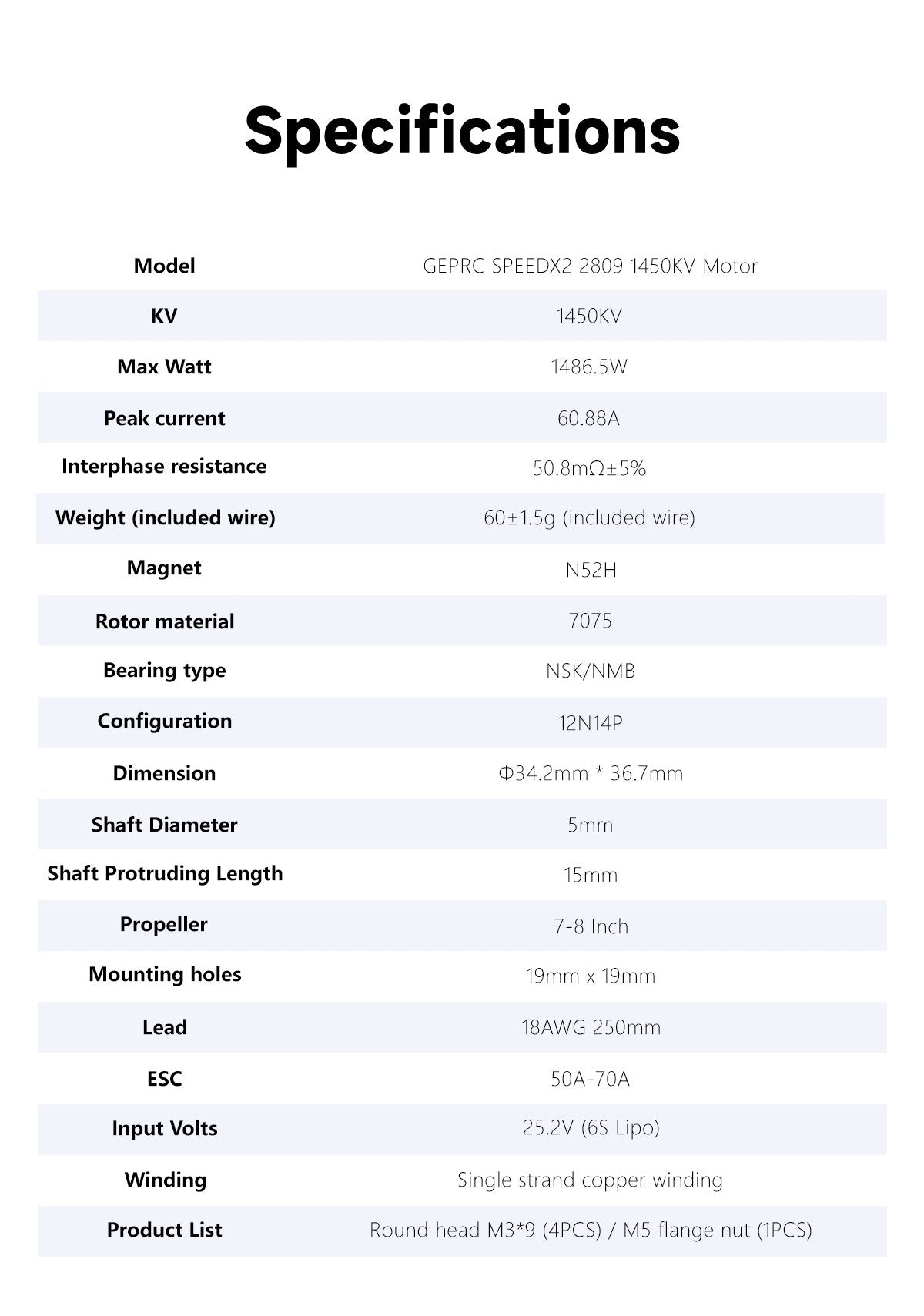 • Model: GEPRC SPEEDX2 2809 1450KV Motor