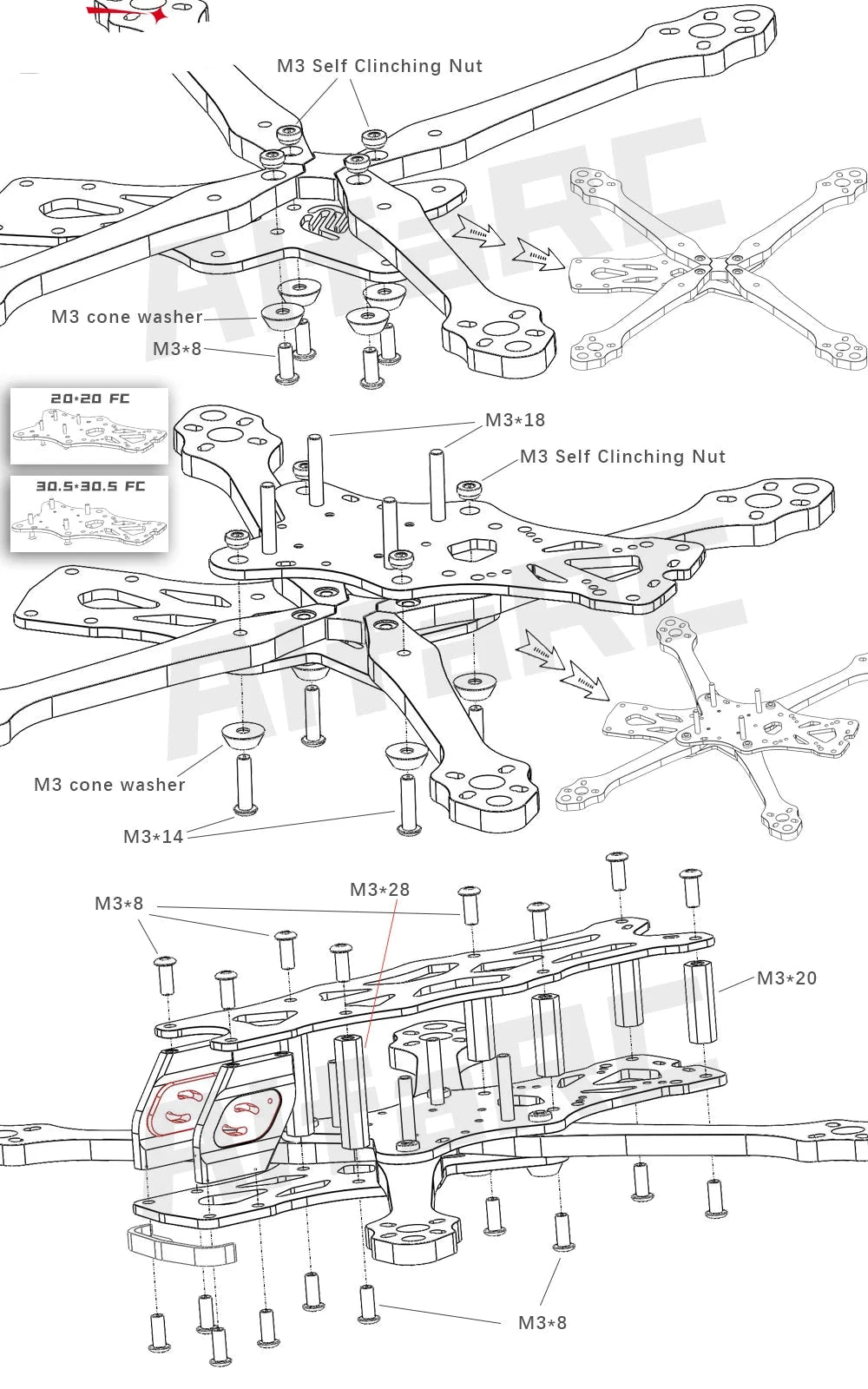 FC Hole distance: (front: 30.5X30.5 / 25.5x25.5 / 20X20MM) / (Rear: 30.5X30.5 / 25.5x25.5 / 20X20MM).