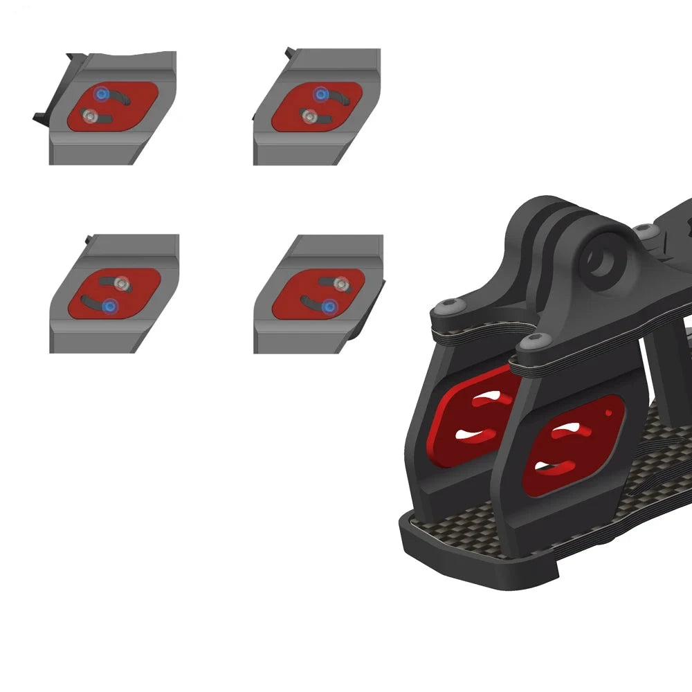 By rotating the TPU inserts 180 degrees, as well as alternating between using the upper or lower bolt as the pivot point, the EVO camera mount has 4 possible mounting positions each 2mm apart.