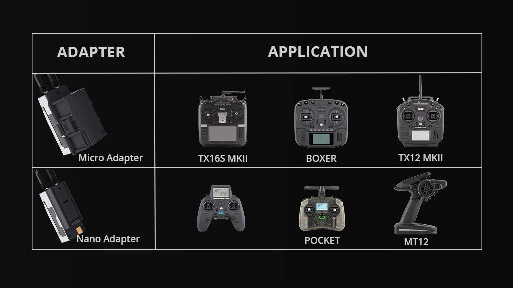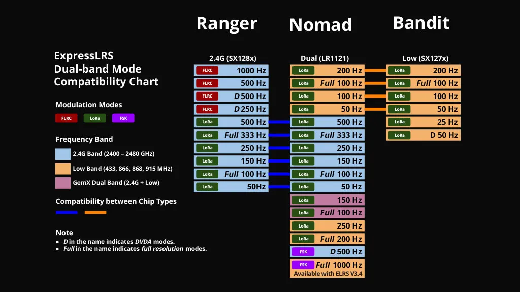 Compatible with all exiting 2.4ghz and 900mhz ExpressLRS receivers. (See mode compatibility chart below)