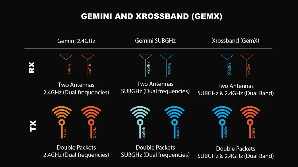 ● Gemini Mode: Experience simultaneous sub-GHz and 2.4GHz transmissions, providing robust performance and reduced interference with a packet rate of 150Hz.