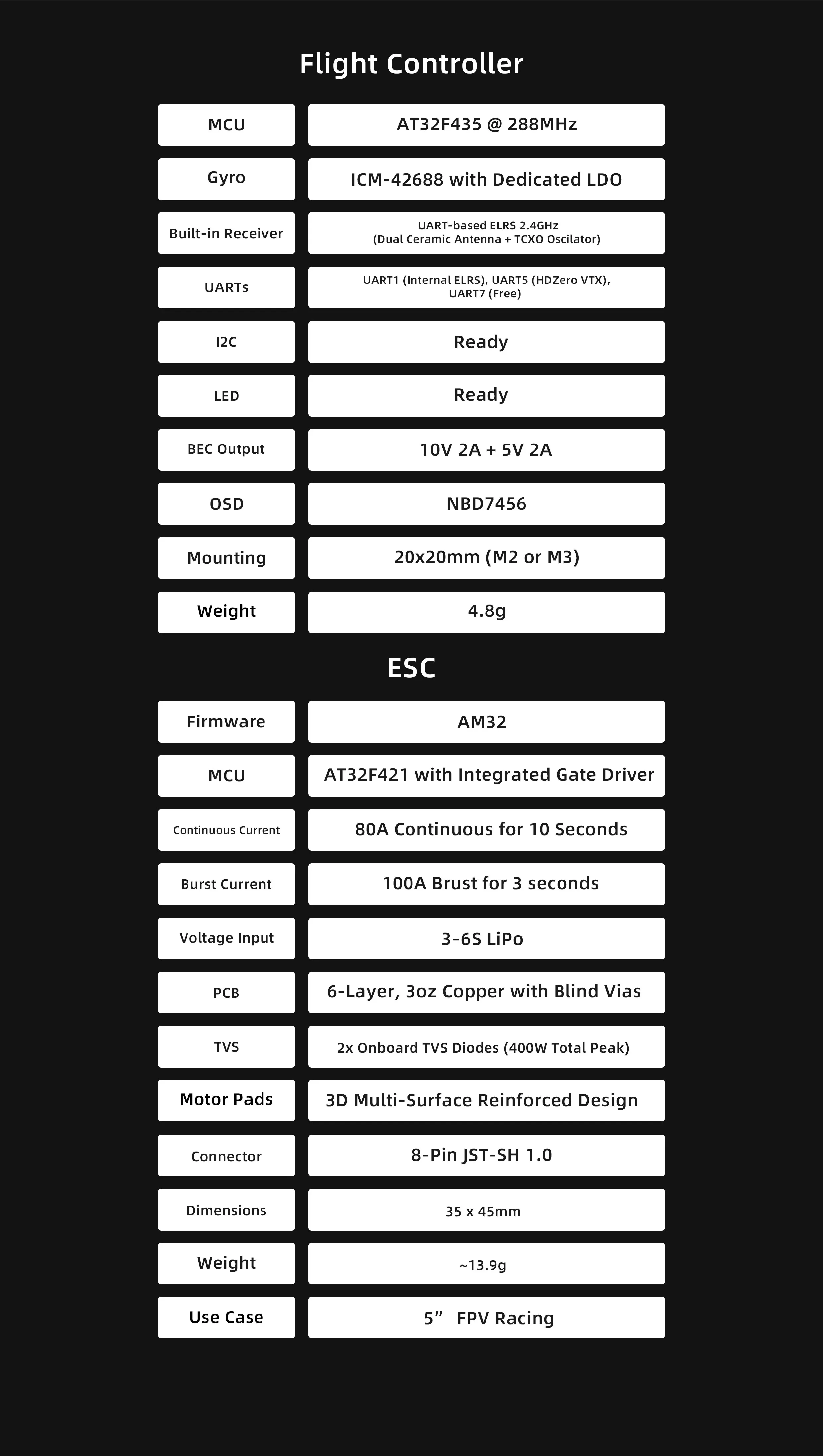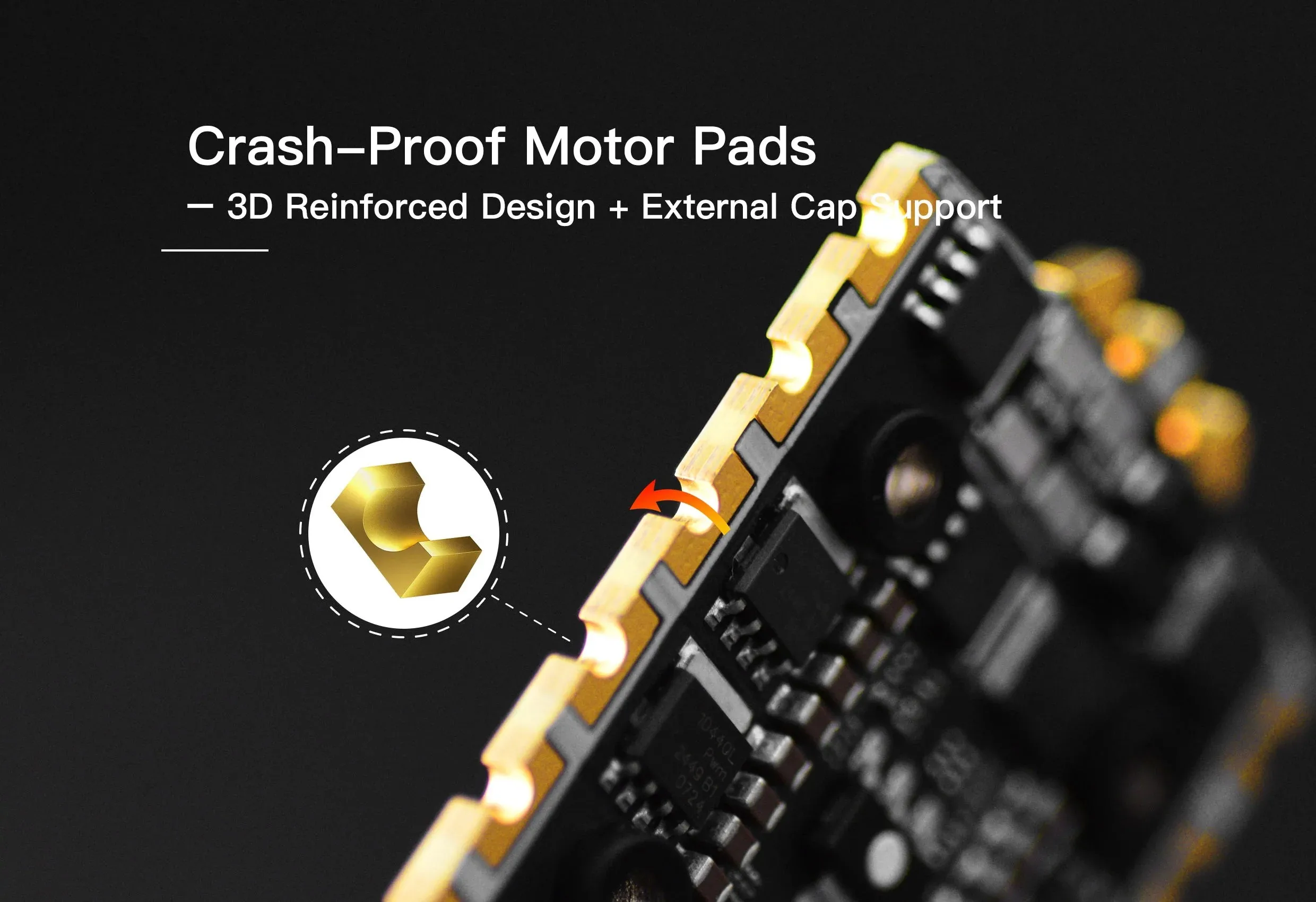 A standout feature is the 3D reinforced motor pad design—with solderable surfaces on the top, bottom, and side—ensuring rock-solid motor wire attachment that won’t rip off even in hard crashes.