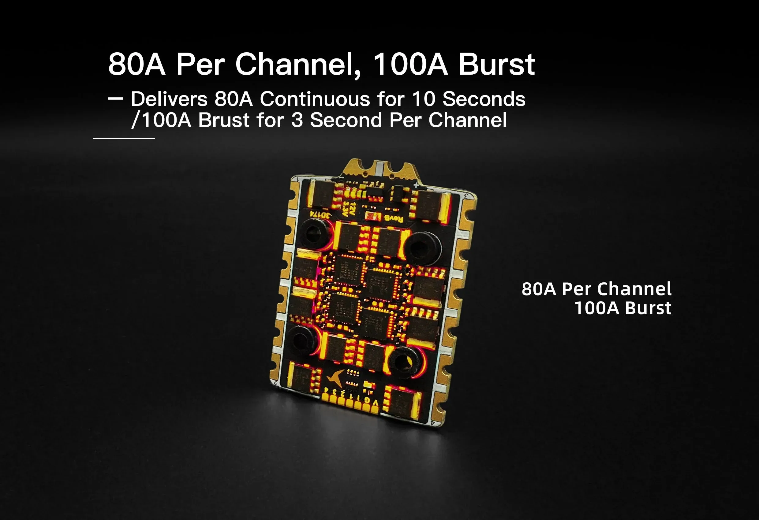 Paired with the FC is the Hummingbird 200 4in1 ESC, rated for 80A continuous for 10 seconds and 100A burst for 3 seconds per channel, supporting 3–6S LiPo input. Built on a 6-layer 3oz copper PCB with blind vias and gold plating, this ESC is engineered to survive repeated abuse. It features three massive onboard TVS diodes for voltage spike protection and four corner-mounted capacitor pads for larger builds.