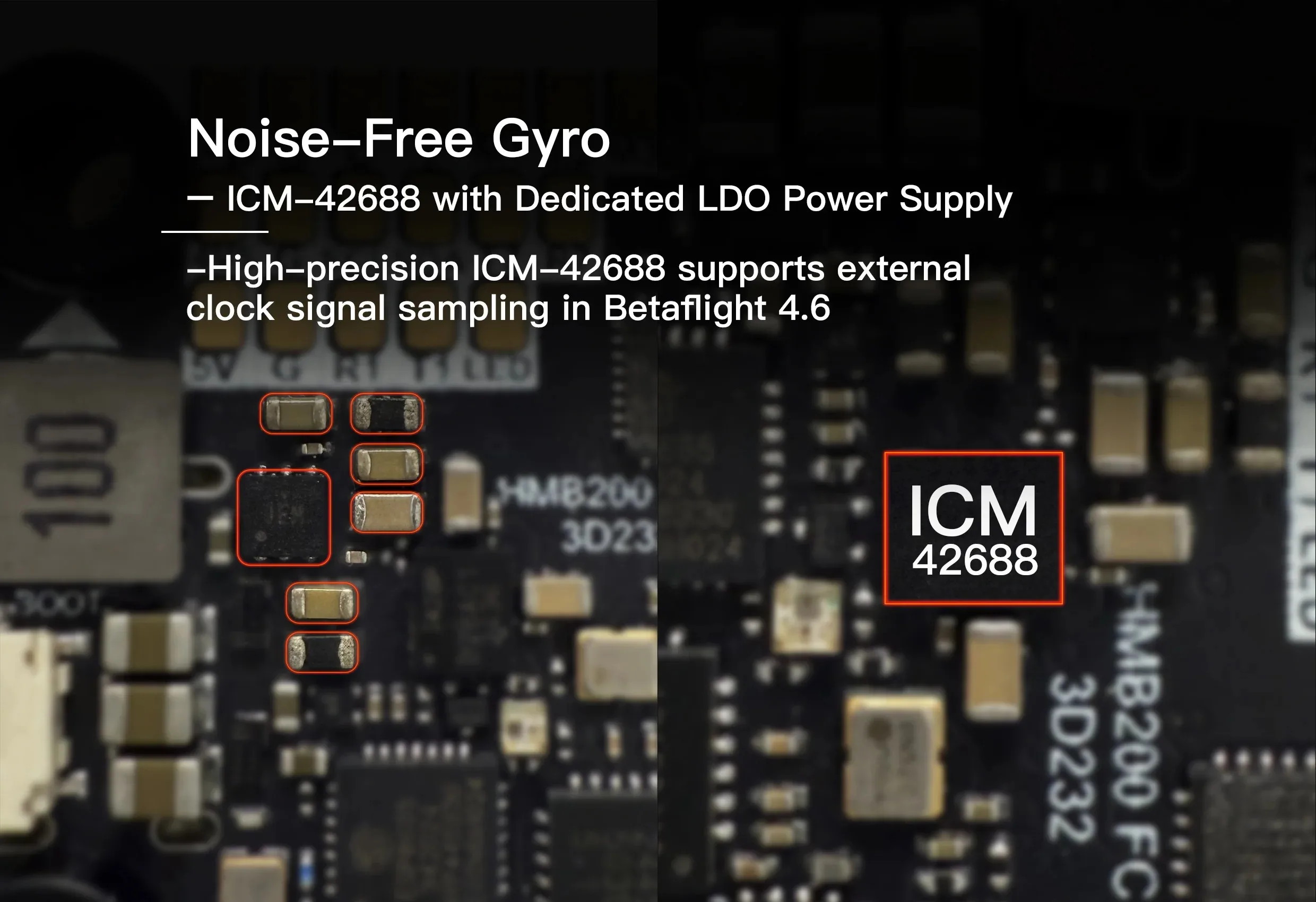 ICM-42688 gyro with dedicated LDO power supply - External clock sampling in BF4.6 reduces gyro noise, improves stability.