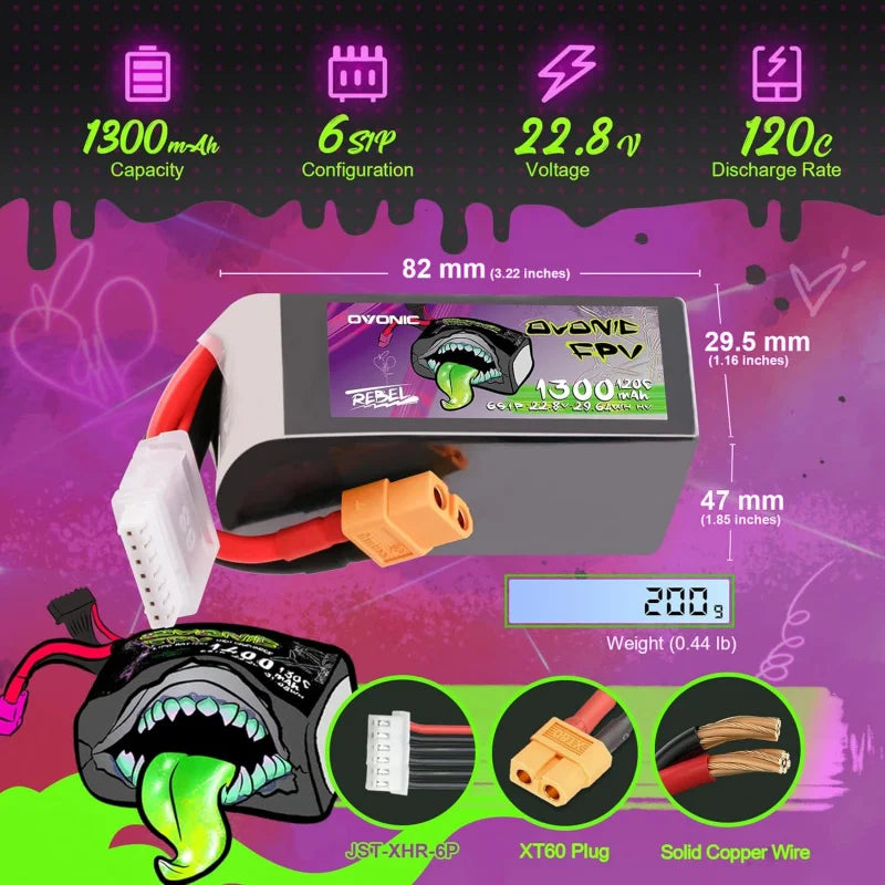 Dimensions: 82/29.5/47mm / 3.22/1.16/1.85inch (L*W*H) Approximate Weight: 200g/0.44lb Chemistry: Lithium Polymer Nominal Voltage: 22.2V Configuration: 6S1P Cell Voltage Range: 3.7~4.2V Capacity: 1300mAh Discharge Rating: 120C Connector Type: XT60 PLUG If you encounter any issues with the product, please feel free to leave a message for our customer service. We aim to respond within 24 hours. In case of quality-related concerns, kindly provide clear photos of the issues directly to our customer service. The efficiency of our support will be based on the clarity of the images provided. For any warranty-related inquiries within the 2-year period, feel free to reach out to OVONIC customer service for resolution. Wishing you all an enjoyable RC experienceīŧ ãAdvanced Lithium Polymer TechnologyãLeveraging cutting-edge lithium polymer technology, this battery exemplifies outstanding energy density and extended cycle life. Meticulously engineered cell design ensures a reliable power supply under demanding conditions, catering to high loads and swift flying scenarios.stands out with an impressive 120C discharge rate. This robust performance translates into heightened thrust and a stable flight experience. ãNoteãPlease stop charging immediately when the cell voltage has been charged to 4.2V (Normal cell voltage is between 3.7V~4.2V).